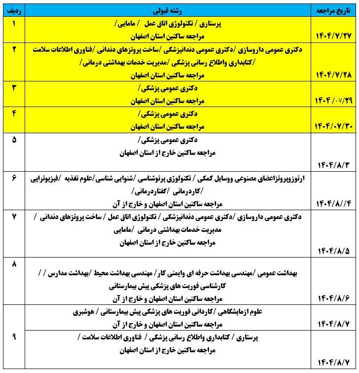 شایان ذکر است فرآیند ثبت نام حضوری پذیرفته شدگان مطابق جدول زیر، از روز یکشنبه مورخ 1404/07/27 لغایت روز چهارشنبه 1404/08/07 در 9 باجه در تالار دکتر نفیسی و طبقه همکف معاونت آموزشی برگزار می گردد.